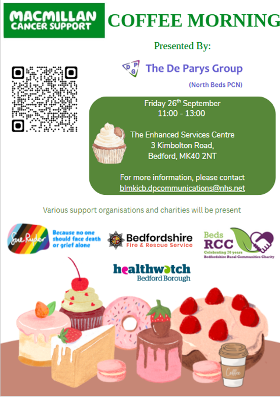 The De Parys Group are excited to host a Cancer Awareness and Macmillan Coffee morning on Friday, 26th September at our Enhanced Service Centre, 3 Kimbolton Road, Bedford MK40 2NT.